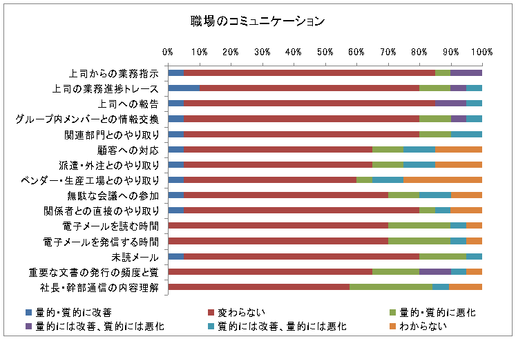 特に「社長・幹部通信のないよう理解」「電子メールを読む・発信する時間」「重要な文書の発行の頻度と質」と重要な項目で「量的・質的に悪化」が多いは注目できる。