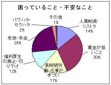 困っていること、不安なことでは、昨年トップにあがった「賃金が低い」がさらに増加し30%でトップに。