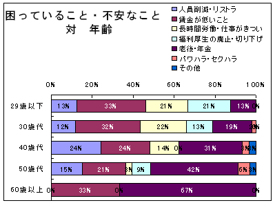 そのほかは年代で分かれており、40歳代以上は「老後・年金」に集中。30歳代はほぼ均等に分散している。20歳代では、「長時間労働・仕事がきつい」と「福利厚生」に不安を感じている。 |