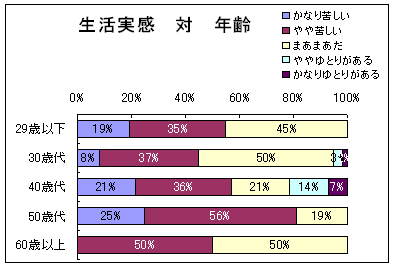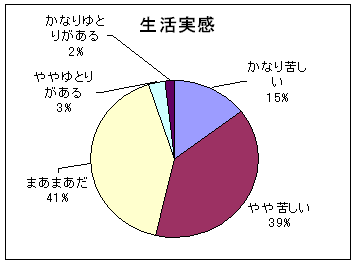 生活実感の実態は、「かなり苦しい」と「やや苦しい」をあわせると54%と「かなりゆとりがある」「ややゆとりがある」をあわせた5%を圧倒。