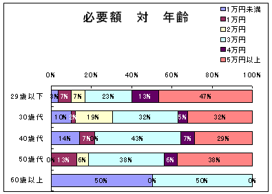 感の高さは変わらないが、30歳代の苦しい感が20%も減少、かといって「ゆとり」感が増えているわけではなく、「まあまあだ」が急増している。 これをこの後の「必要額」との関係を見ると興味深い。