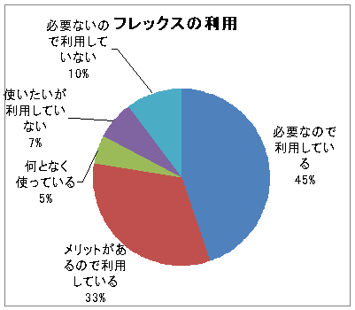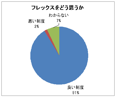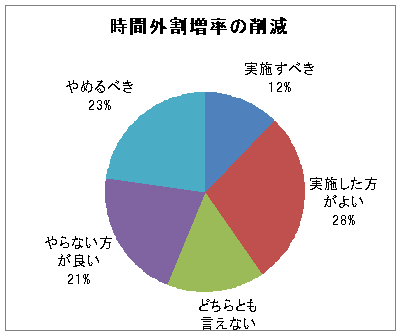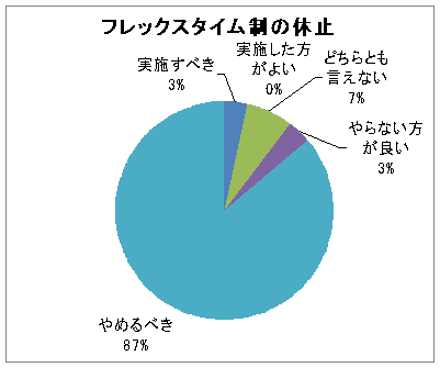 「時間外割増率の法定基準への変更」はやっても良い。なぜならば「全員残業0」を徹底させられているから。サービス残業バリバリです。サービス残業減らしの為にもフレックス制は無くしてはいけない。(サービス残業は組合員が自主的にやっており管理職からの圧力はありません。ただ、残業の手続きが面倒になってから時間外をつけない人が以前にもまして増えました)