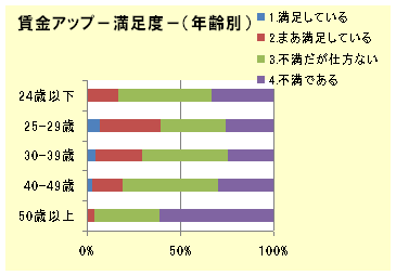 実際の賃上げ額が少ないことと関連していると考えられる。ただし注目しべきは、24歳以下の若年層が50歳以上の次に不満が多い点である。 |