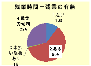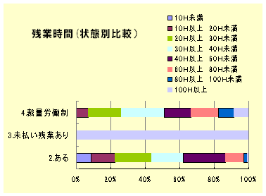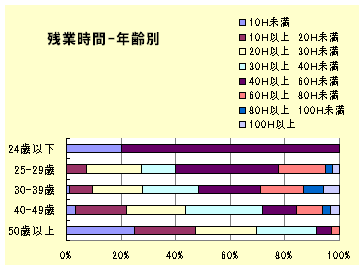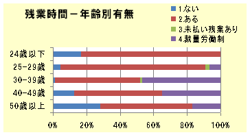 20代では8割以上が残業をしており過密労働だけの問題だけではないと思われる。30代は裁量労働が多いだけでなく、残業者も多く、残業のない人は皆無に近い。 |