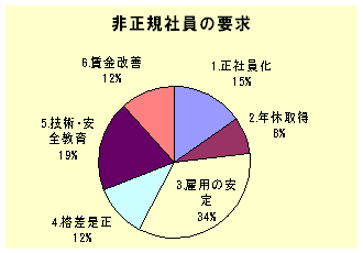 非正規社員の要求は、ダントツで「雇用の安定」。急な「雇い止め」など雇用の不安定さが一番の気がかり。希望する人の正社員化のハードルを低くする、法整備が必要。 |