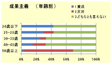 しかし、「どちらとも言えない」が20代から40代まで全て過半数を占めることも注目される。成果主義が実行レベルでうまく機能していないこと、現実には賃金抑制策として機能していることなど、成果主義の欺瞞性が認識されつつあるのかも知れない。 |