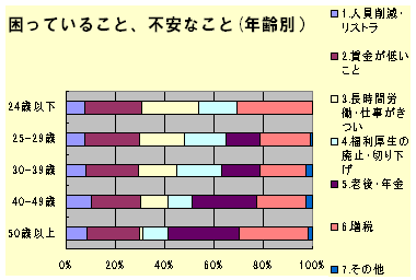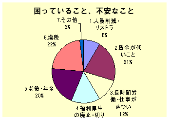 困っていること、不安なことでは、「増税」、「賃金が低い」「老後・年金」で6割を占め、であり、生活への不安と将来への不安が他を大きく引き離している。