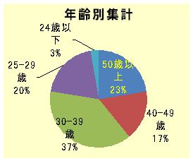 回答者の年齢分布は、30−39歳が 37%ともっとも多く、次に 50歳以上、3番目に25−29歳が続いている。