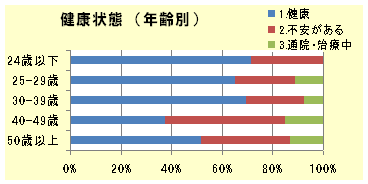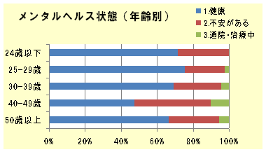 は他の世代に比べ、群を抜いており50%以上が「不安」「通院・治療中」と早急な対応を図らないと本人にとっても、また会社にとっても大変な事態になる。といわざるを得ない。