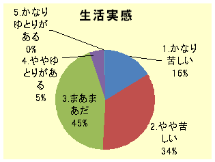 「生活苦しい」が過半数。「ゆとり」感はなし。 生活実感の実態は、「かなり苦しい」と「やや苦しい」をあわせると5