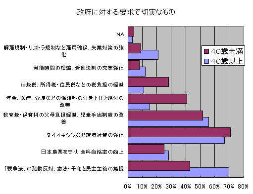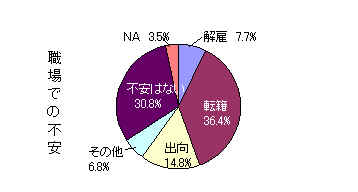 今年の質問では、雇用不安について、具体的にたずねました。その結果、解雇・転籍・出向の不安なしに働いているという人は僅か30%と3人に1人にすぎないことがわかりました。しかも8%弱の人が解雇を、30%の人が転籍の不安を持っており、これでは落ち着いて仕事もできない状況です。解雇規制や転籍に歯止めをかけるなど、労組の取り組み強化が急がれています。