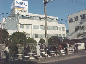 NHKスペシャル 「1万人の配置転換・インターネットが巨大企業を変える」〜NEC密着ルポ放送(4/22)! NECの光と陰に迫る! 2000.3.11付 読売新聞 「フレックスタイム制”悪用”残業手当実質カット 労基法違反容疑 労働省が調査へ」 読売新聞は3/11付け記事で、労働省が日立、東芝など大手電機メーカー数社に対して、来月から労働基準法違反の疑いで立ち入り調査を実施する方針を固めたと報道しました。詳細はここクリック 2000.3.2 NEC無線電子の整理統合に対する門前宣伝行動を行う! NEC無線電子は業績悪化を理由に4月1日をもって、無線関連の事業はNEC福島と合併し、同時に防衛庁関連の事業はNECネットワーク・センサの府中事業所へ移管し、神奈川県大和市の大和工場を閉鎖すると発表しました。