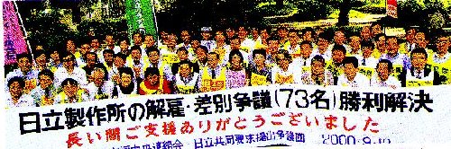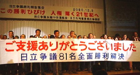 2000.11.12 2001年の企業社会 良い会社とは何か(1992年日経産業新聞) 今をときめく経済企画庁長官 堺屋太一氏が1992年、新聞のインタビューに答えて21世紀にあるべき企業社会像を縦横に語っています。まさに今起こっている食品会社の品質管理のずさんさ、自動車会社のリコール隠しに見られる品質低下を予測したものです。長官として是非この論点でリーダシップを発揮していただきたいと強く感じた次第です。詳細はここをクリック(pdfファイル27KB) 2000.11.11 高給はストレスの代償!(9/1付日経産業新聞「電脳ウオッチ」より) 成果・業績主義である新人事処遇制度がNECで導入されましたが、社員間、管理職間の競争の激化、頻繁な評価などにより、ストレスが激増し、健康破壊や過労死の増加が心配されます。そこで、「成果主義」先進国、アメリカのシリコンバレーにおけるワーカーのストレスの実態をルポした記事を紹介します。ぜひご一読を 2000.9.12 日立争議 勝利和解! 日立の73人 勝利の笑顔 大企業日立についに勝った! 2000.9.05 業績評価、結局は上司との相性!(7/7付け日本経済新聞「電脳ウォッチ」より 10月にNECでも導入されようとしている「新人事処遇制度」。その命ともいえる業績評価が本当に公平・公正におこなうことが可能なのか、関心の高いところですが、アメリカ・シリコンバレーの業績・評価の実態で衝撃的なニュースが日経新聞に掲載されましたのでご紹介します。 2000.5.14