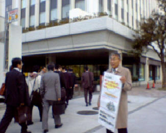 3日、中河原技術センターでは、NEC労働者懇談会のメンバと支援に駆けつけた元横河電機のメンバによって、7時30分から配布を開始、「NECフィールディングは、千人の人減らし案を撤回し、社会的責任を果たせ」と書いた「吊り看板」