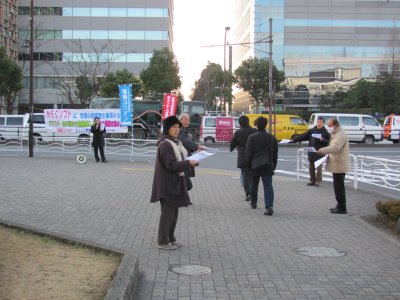 「NECソフトはパワハラ・退職強要を反省し、解雇撤回を! NECソフト 人事総務部が行ってきたパワハラ、退職強要の実態!」のビラ配布を中心とした宣伝行動を行いました。