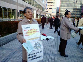 1月27日(木)にはフィールディングの本社があるJR田町駅で、2月3日(木)には川崎工場があるJR川崎駅でELICNEC1月号を配布し、「大リストラをストップさせよう!」と宣伝しました。
