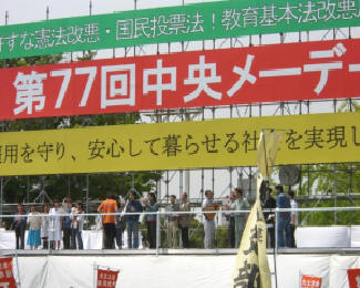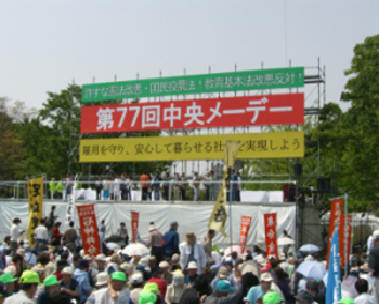 東京代々木公園で開催された中央メーデーには4万4千人が参加、「安定した雇用と人間らしい働き方を」「憲法と教育基本法の改悪反対」の声を上げました。