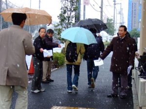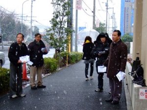 雪が降りしきる中、鴨居のNEC真空硝子前で「希望する誰もが雇用延長を選択できる制度に!」と宣伝行動を行いました。配布したELICNEC2008年1月号の受け取りもよく、職場へ急ぐ 人たちが、次々と手にとって中に入っていきました。 今回の宣伝行動は、60歳をすぎてもこの会社で働きたいと希望するAさんに対し、会社は、「昇級が標準に達していない」と除外したことに、発端があります。 そもそも国が雇用延長を取り入れたのは、厚生年金支給開始を65歳に引き延ばしたことにあります。厚生労働省は「原則は希望者全員を対象とする制度の導入を求めて」います。選別規定を設けないのが法の精神です。