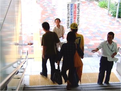 今回は、早朝と午後の2回実施し、合計1000枚超を配布しました。門に入る人、門から出る人、ともに「ご苦労様、お世話になります」などの声かけして受け取る人が多く見受けられました。 ニュースを配布しながら二十数名の人に聞いたところ、NFASの半数近くの人は、NECELへ復帰するとのこと。ELICNECニュースで訴えている、本人の希望があれば、NECグループ内で働く場所が確保できることを証明しています。NECELの経営陣が決断すれば可能です。