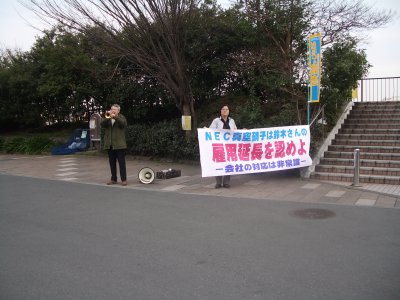 宣伝に参加した人は代わる代わりにハンドマイクを握り、「NEC真空硝子は、女性差別をただして鈴木さんの雇用延長を認めよ」「NECグループは、人員削減を止めよ。雇用責任を果たせ」などを訴え、「希望する全員が雇用延長できる制度に変えて