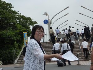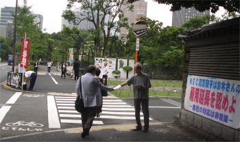 の雇用延長制度の問題を切々と訴えました。「株主総会参加ご苦労様です」と元気よく声かけてビラを渡すと、ほとんどの方が、受け取ってくださいました。また今のNECの経営のあり方に「NECは無配だよ!矢野(社長)は首だ!」と、怒りをあらわにした声で話しかける方もいらっしゃいました。